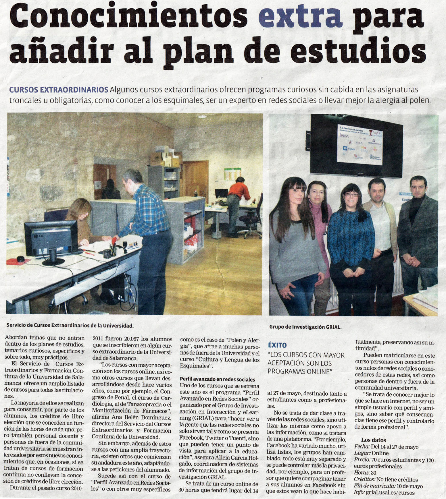 Tribuna Universitaria ha publicado un artículo sobre cursos curiosos que se ofrecen desde la Universidad. Entre los cursos con mayor aceptación se encuentran los programas online, destacando el programa "Perfil avanzado en redes sociales", ofrecido por GRIAL.
